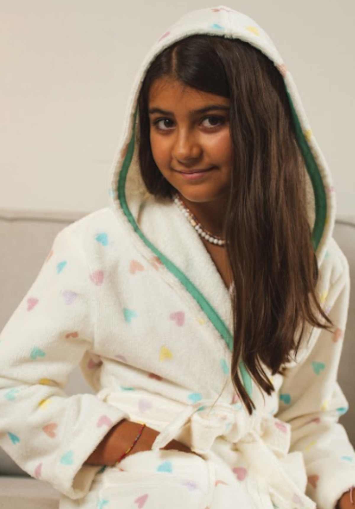 Albornoz infantil para niña en suave color beige, con delicados bordados y corazones en esmeralda. Cómodo, cálido y perfecto para el baño o el descanso en casa.